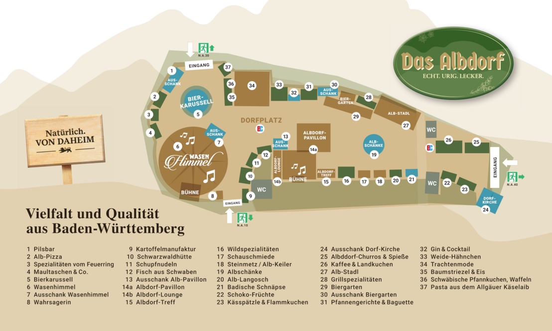 Im Albdorf steht das Thema Regionalität hoch im Kurs. Mindestens 75 Prozent aller angebotenen Produkte an den über 30 Ständen stammen aus Baden-Württemberg – in erster Linie aus dem Alb-Raum sowie aus Württemberg. Spezialitäten aus Baden gesellen sich dazu. Nahezu 100 verschiedenste leckere Gerichte und Getränke stehen auf den Speise- und Getränkekarten.